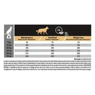 Voir le tableau des rations journalières recommandées (g/jour) pour le maintien ou la gestion du poids. Ces rations sont données à titre indicatif. Maintien du poids : pour aider votre chien à maintenir une condition corporelle idéale, les rations journalières doivent être adaptées à l'activité de l’animal, sa condition physique et ses besoins individuels. Si votre chien est en surpoids : respectez la ration journalière recommandée et ajustez de manière à obtenir une perte de poids mensuelle d'environ 2 à 4 % de son poids. De l’eau fraîche et propre doit toujours être à la disposition de votre chien. Pour surveiller la santé de votre chien, consultez régulièrement votre vétérinaire.