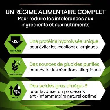 Aliment diététique complet pour chiots* et chiens adultes pour le diagnostic et la prise en charge des allergies et intolérances alimentaires, avec des protéines hydrolysées et des sources de glucides sélectionnées.